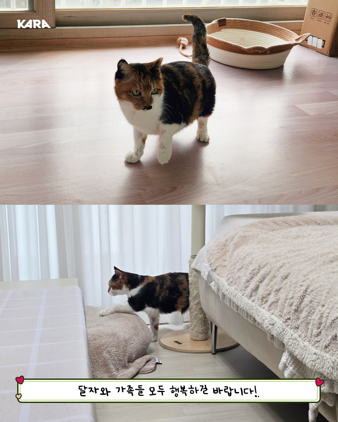 애교쟁이 달자는 여전히 사람이 잘 보이는 창가에 있는 것을 좋아하고 구석에 숨어서 사람을 피하던 달숙이는 조금씩 용기를 내고 있어요. 장난감을 가지고 놀아주다보면 어느새 슬쩍 가까이 다가와 툭툭 건드리곤 한답니다. 달숙이가 조금 더 용기낼 수 있게, 달자와 달숙이 모두 즐거운 생활을 할 수 있도록 응원해 주세요!
